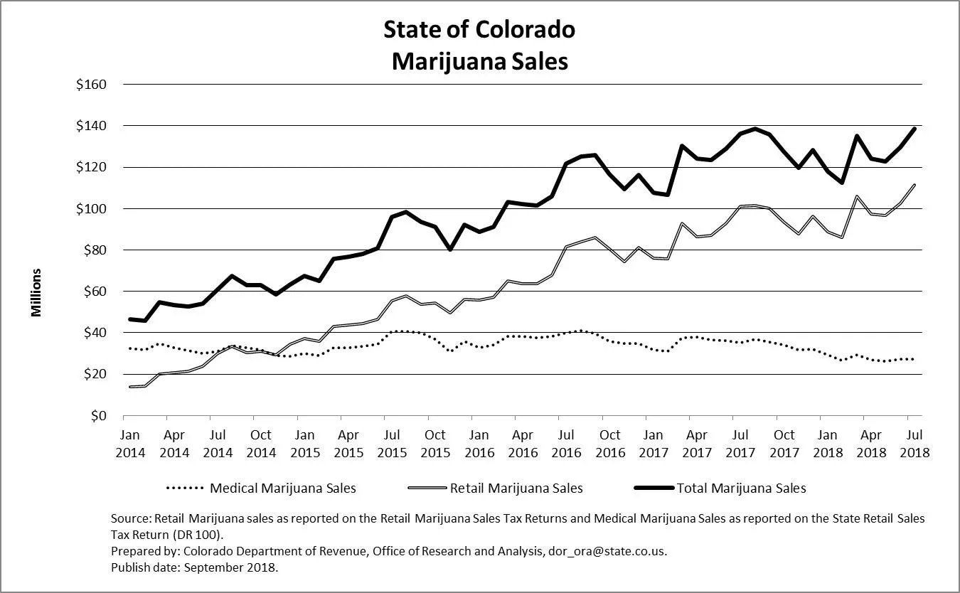 Colorado marijuana sales continued their summer uptick in July with record-breaking sales, according to the Colorado Department of Revenue. The state’s dispensaries collected over $138.5 million, the highest monthly sales figure so far, just beating August 2017’s tally of $138.46 million.