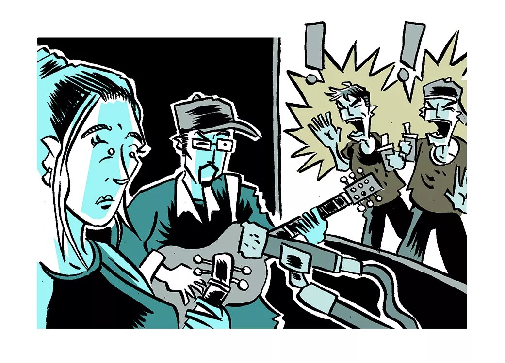 Clint Bales: “About a year ago, we played a show at Tennyson’s Tap, and off to the side of the crowd were a couple of older drunk guys who liked to yell out comments at performers, kind of like the two old guys from The Muppet Show who constantly hurled insults from the balcony – only these guys were shouting catcalls and sexually suggestive remarks at my bandmate, Amy. That made me want to put down my guitar and punch them both in the nose. Since this was our first and only experience with heckling, we looked over at each other for a second before continuing undeterred. We weren’t going to let these jerks derail the music we had come to share! Maintaining her professionalism, Amy continued to sing her heart out like nothing was wrong.