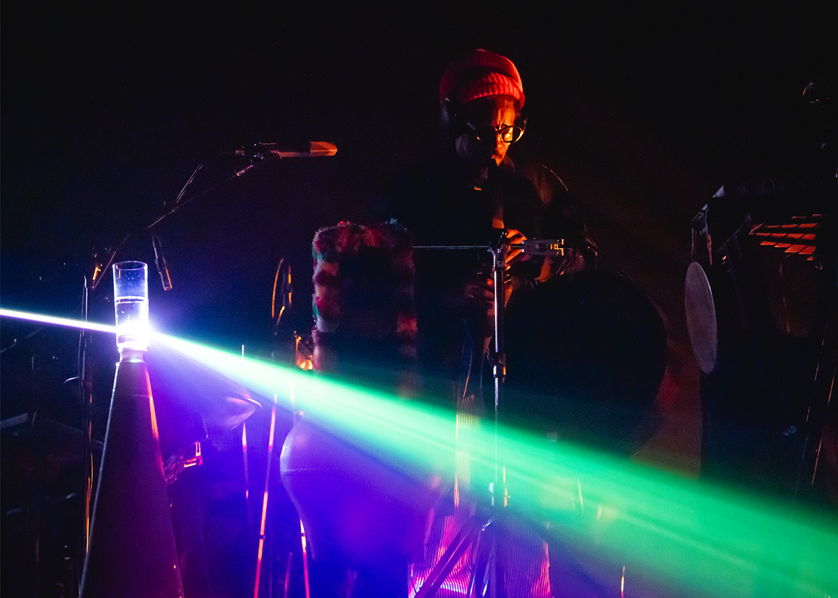 The light held, like a frozen laser beam, and André slowly took shape – big red stocking cap, large black headphones and frames – surrounded by the music as it swelled; deep and ominous synths from Botofasina’s throne of keyboards to the left, skittery drumming uncoiling from Parks on the right; and a forest of whispering noise from Niño in the rear, who played maracas, shells and a Whirly Tube in addition to his full drum set.