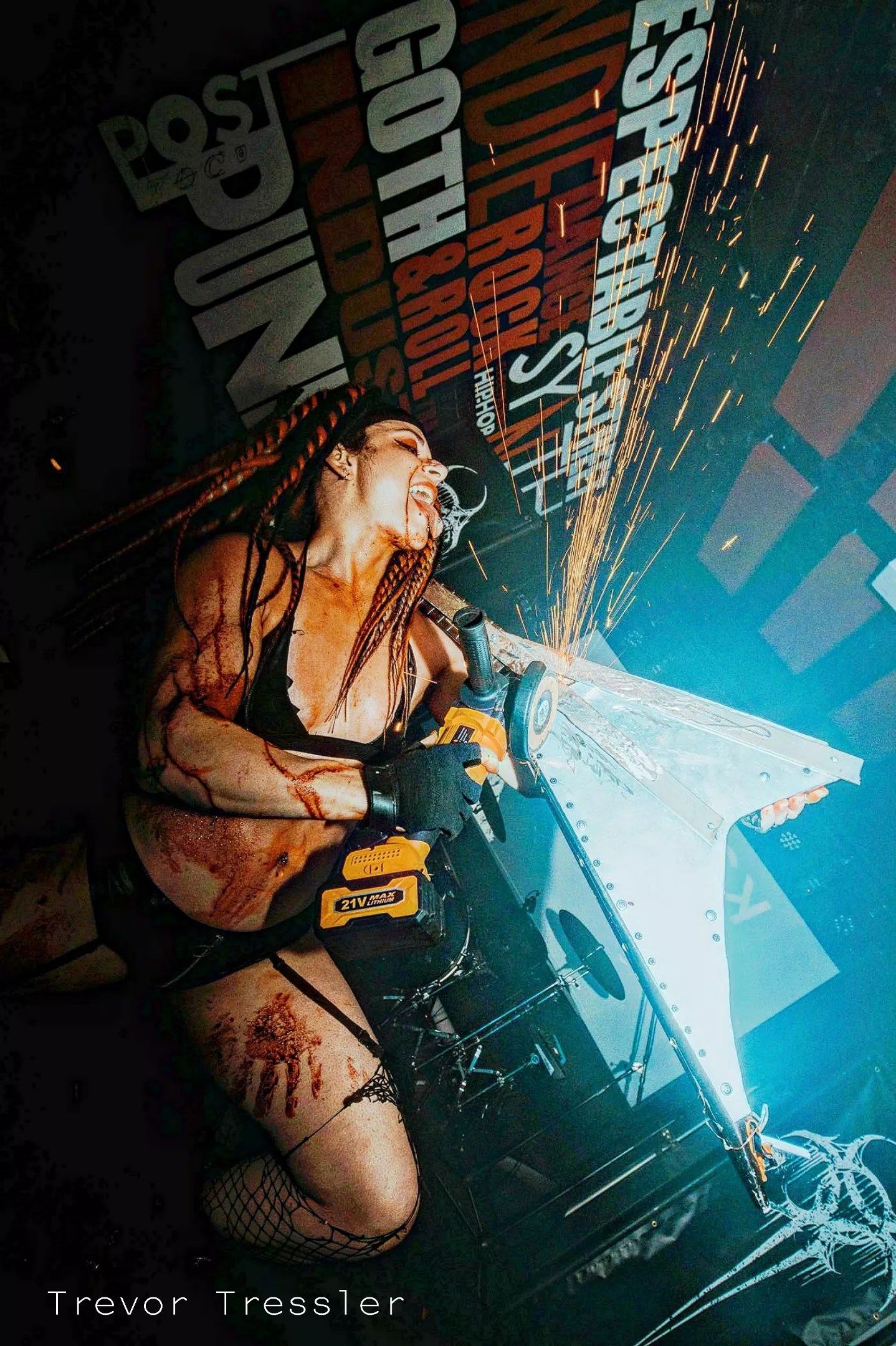 Her fire performing began in Texas with a metal band whose off-the-wall performances made sparks fly – literally. “They have a whole circus with their band, so metal grinders, fire, aerials, blood, everything,” Gallo says. “So I was inspired by that, and the music brings that loud, grinding sound, so it makes sense.”