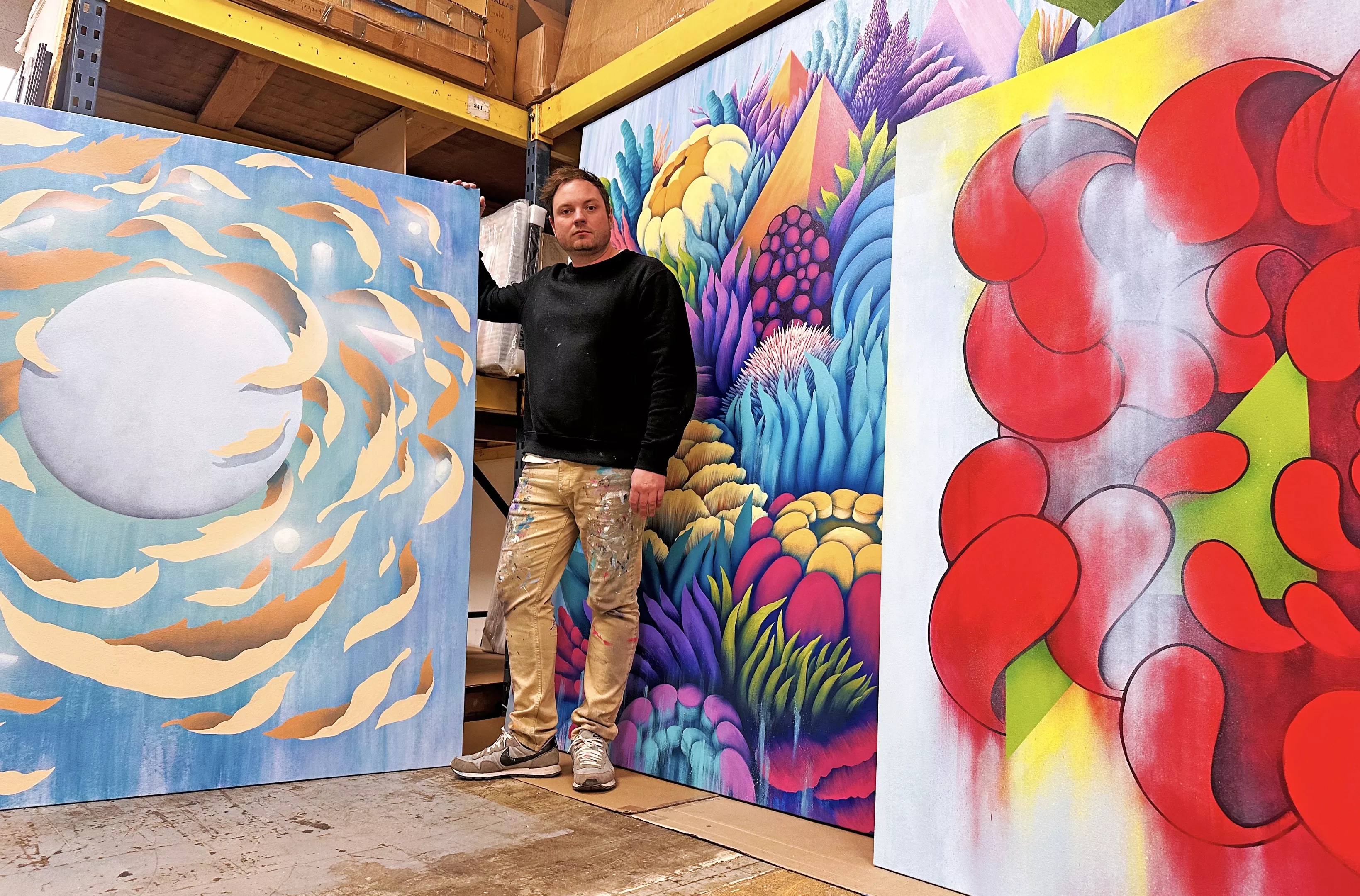 RUMTUM at his studio with his latest paintings.