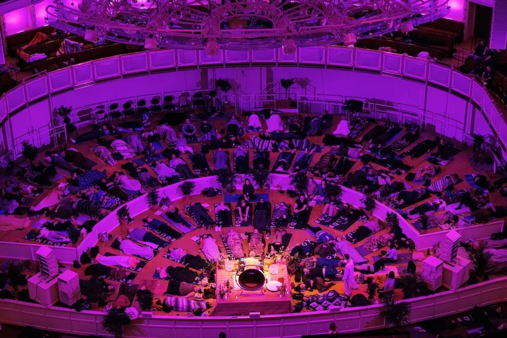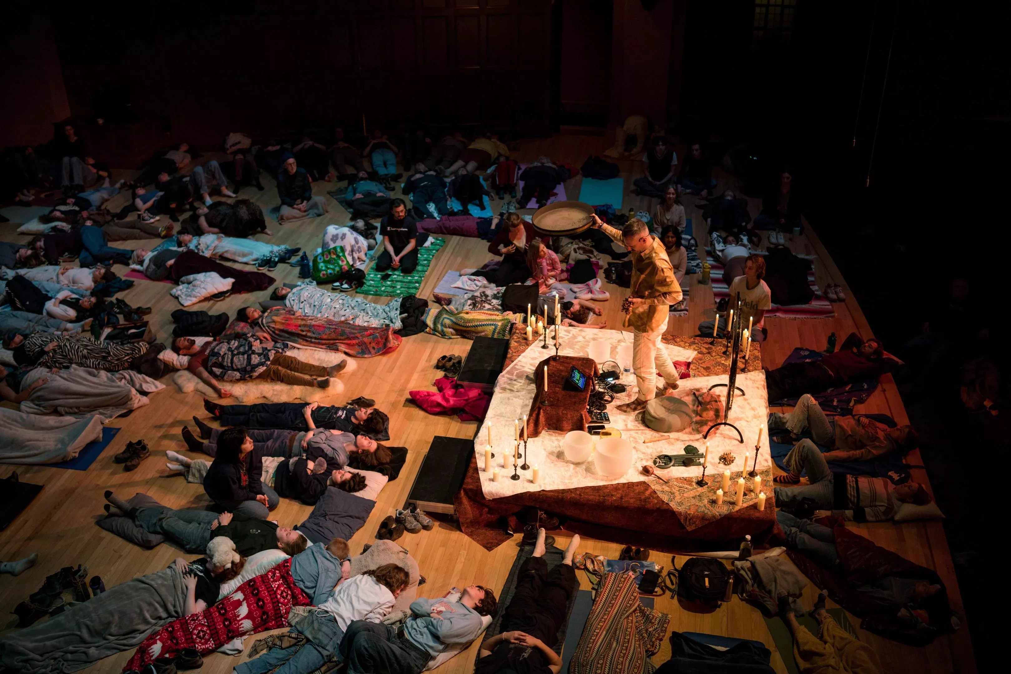 “I’m interested in growing this,” he says. “I see it happening in large stadiums and massive concert halls, with thousands of people lying down. I believe in the ability of this experience to move into much larger spaces while remaining explicit that it is intended to create a space for healing.”