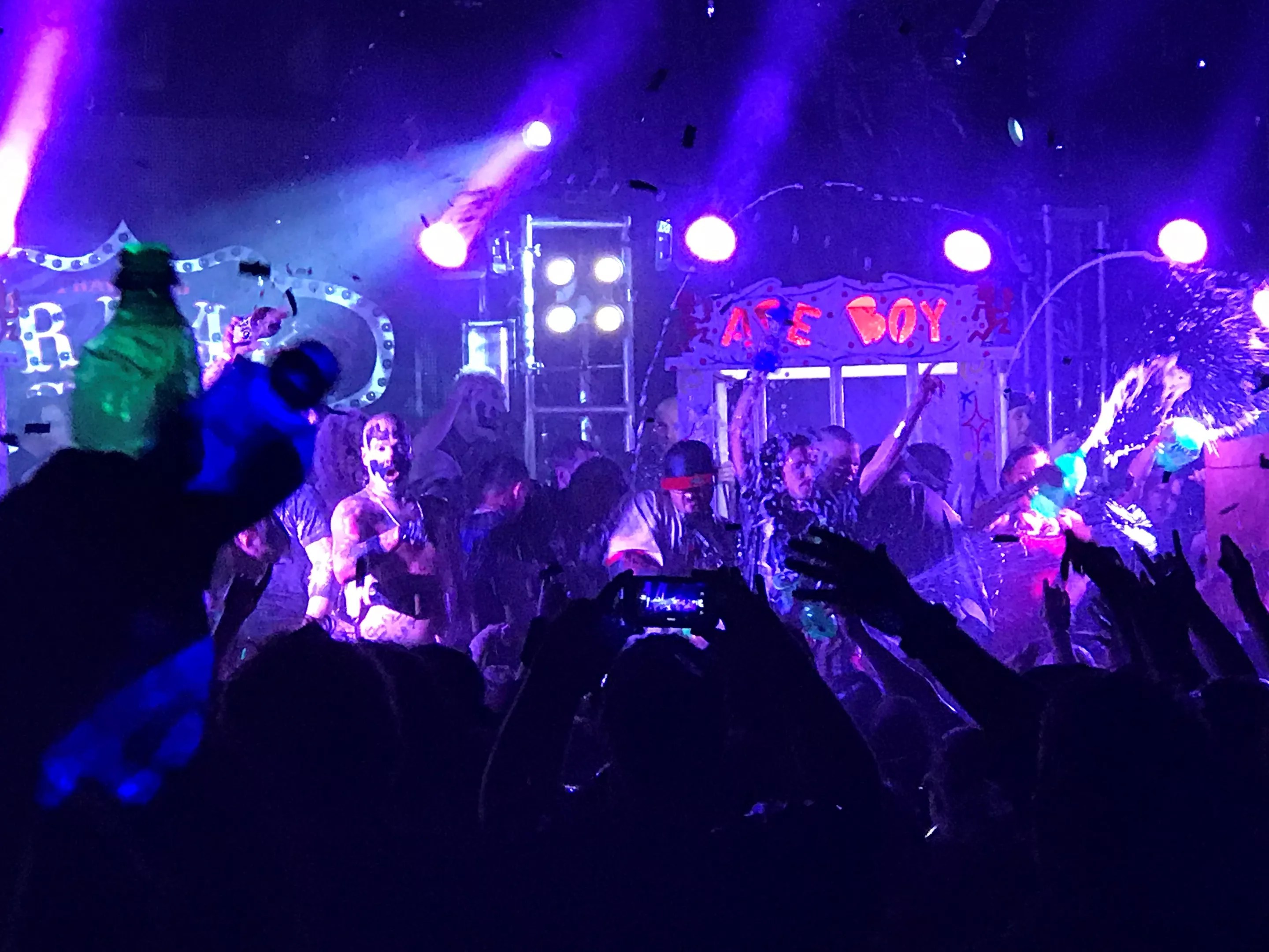 Like most of ICP’s shows, Aurora’s was a mix of crude and lackluster sing-songy rap, carnivalesque spectacle and flying two-liter bottles of Faygo – a Detroit brand of soda the group showers audiences with.