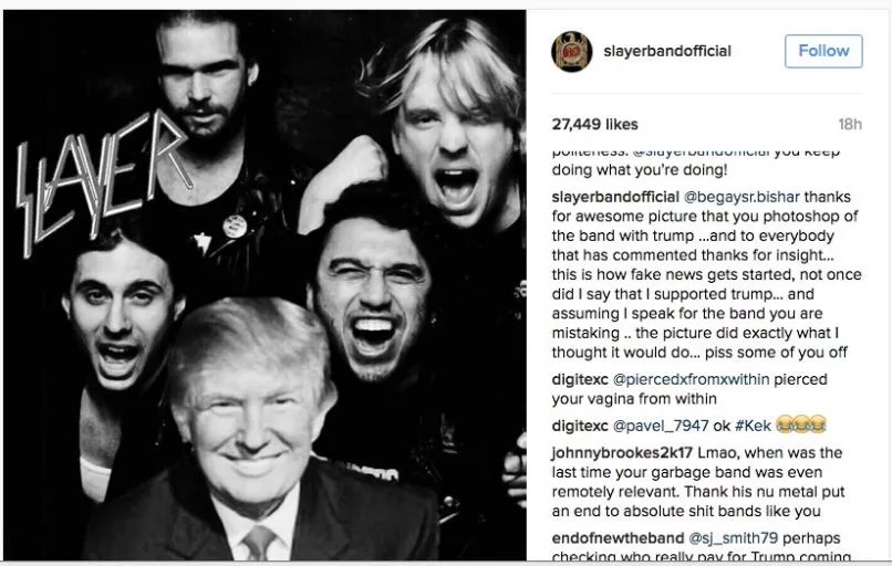 Criticism of the band’s politics flared up after Donald Trump was elected and lead singer Tom Araya, unbeknownst to his bandmates, posted a Photoshopped picture of the grinning musicians with Trump to the Slayer Instagram page. On social media, critics unearthed old accusations of fascism that Repentless and a trio of gruesome music videos – one of which portrays Nazis as sadists who deserve to be murdered – should have put to rest.