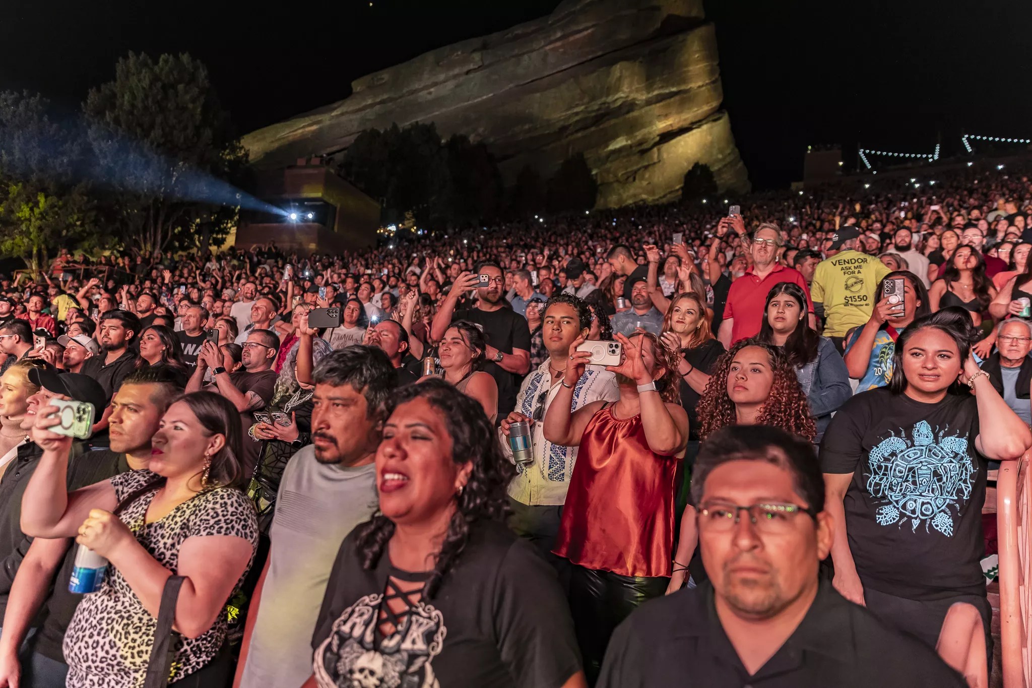 At Red Rocks, the band was welcomed by a sold-out crowd of fans from countries such as Mexico, Colombia and Honduras. Flickering lights lit up the amphitheater before Vallín played the electric guitar and Olvera walked onto the stage for the opener, “Dejame Entrar.”