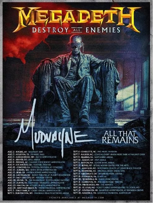 Megadeth frontman/founder Dave Mustaine (who was booted from Metallica before that band released its debut album), shares: “Our ‘Crush the World’ tour has been a tremendous experience for the four of us. We are all playing tight, and that has made it possible for me to really focus on solos and singing, we are playing more songs than ever before, and we are closer to each other, onstage AND off. I’m excited to see Mudvayne, and All That Remains. Join us as we DESTROY ALL ENEMIES.”