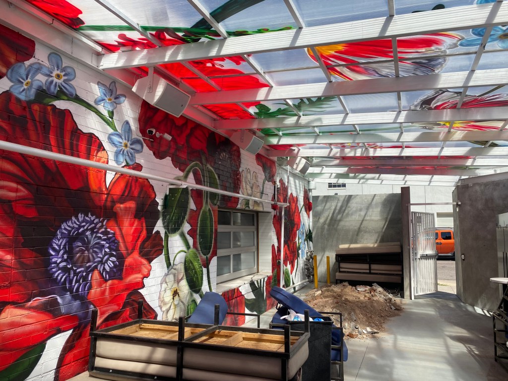 The flowers are still in virtual bloom at Parea, and during a tour of the facility, he makes it clear they’re not going anywhere. The rest of the joint is striking, as well. Light fixtures on trendy industrial scaffolds are in place, a striking mural overlooks seating areas stacked with chairs and tables, and decorative plants are arrayed in a neat row. With the exception of a few spots where small piles of soil have yet to be floored over, it seems customer-ready. Yet permission to hang the “open” sign remains elusive.