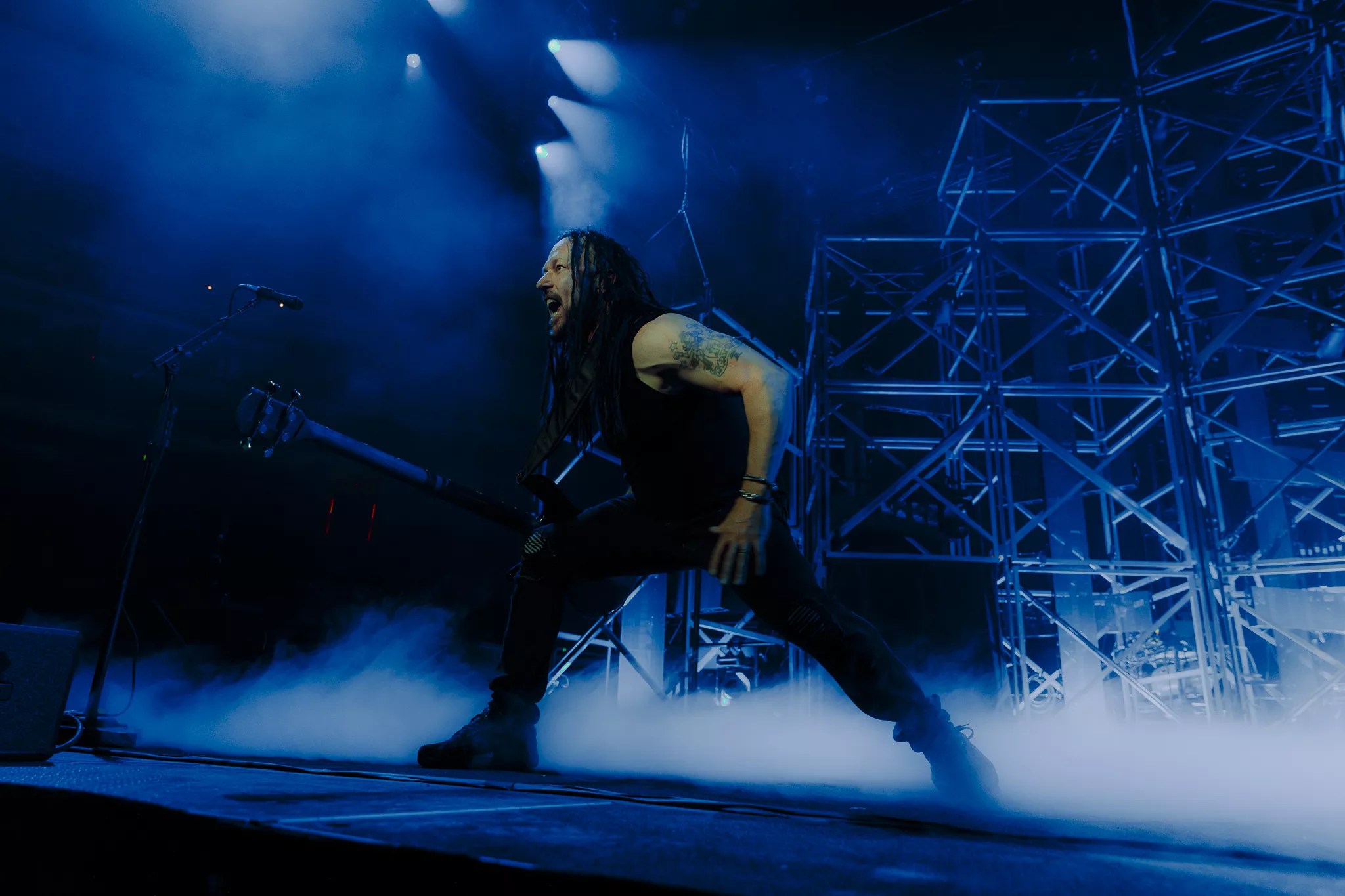 Disturbed Bassist John Moyer performs for the crowd.