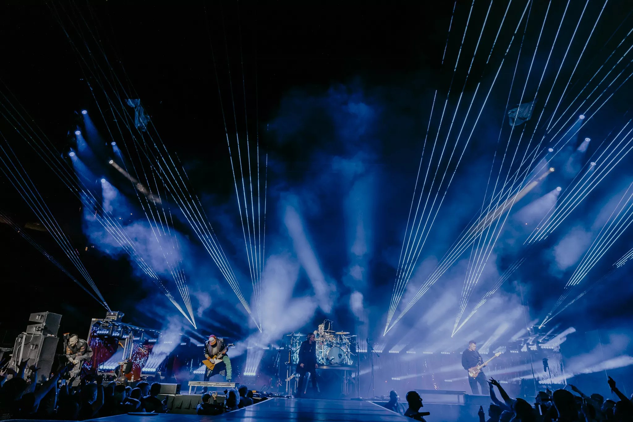 Mike Wengren, Disturbed’s drummer, embracing the crowd at Ball Arena.