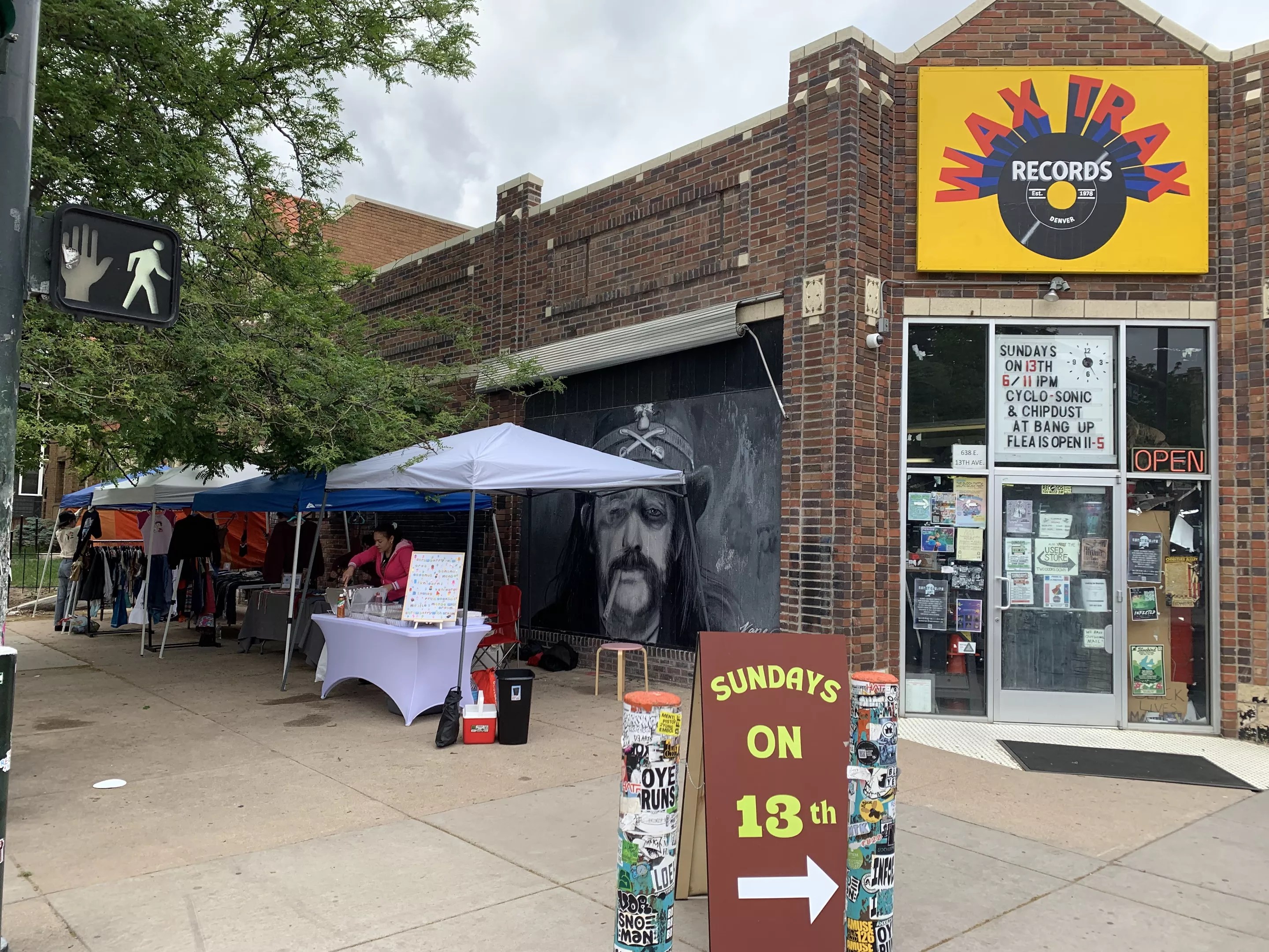 This weekend, the Plastic Rakes and Twinheads are playing at the Sundays on 13th Flea Market. The market has been a weekly tradition since its conception during the pandemic; it hosts fifteen to 25 vendors, including artists, purveyors of vintage clothes and skin-care booths. Pete Stidman, co-owner and general manager of Wax Trax, notes that anyone can get involved as a vendor or performer, though he does put performers “through the filter of our snarky Wax Trax employees. If the band makes it past them,” he says, “then you know they can play.”