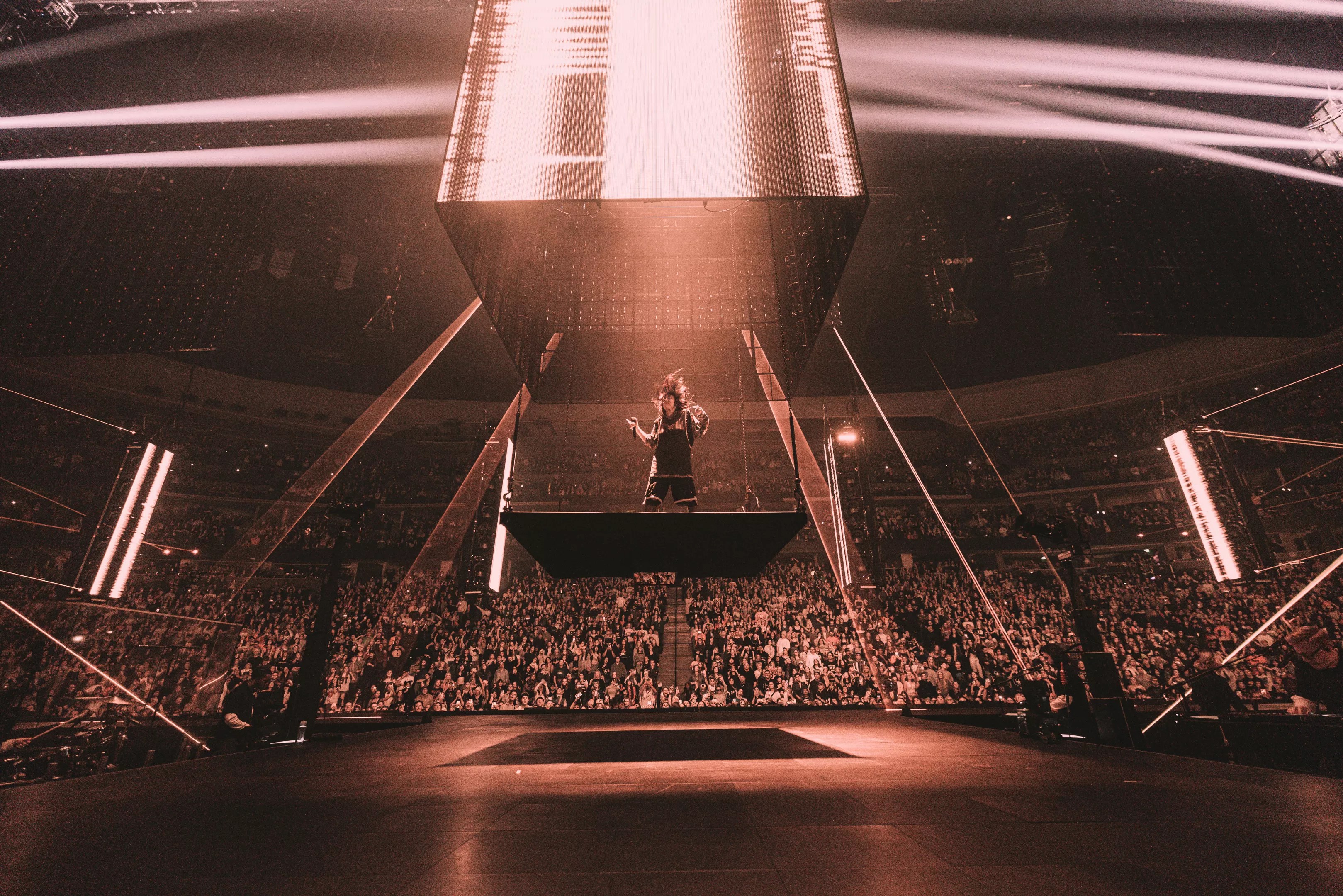 She showed us that and more when she performed hits from all her albums at Ball Arena on November 19, the first show of her sold-out, two-night run. The venue was completely filled around the stage, a long rectangle in the center of the floor with two cut-outs in which the band had set up. Anticipation was at its height when a cube in the middle lit up and rose up and down, and the venue began to vibrate from the bass while deafening shrieks poured out of the crowd. Then Eilish appeared on top of the cube, beaming out at the audience before launching into “CHIHIRO,” off her latest album.