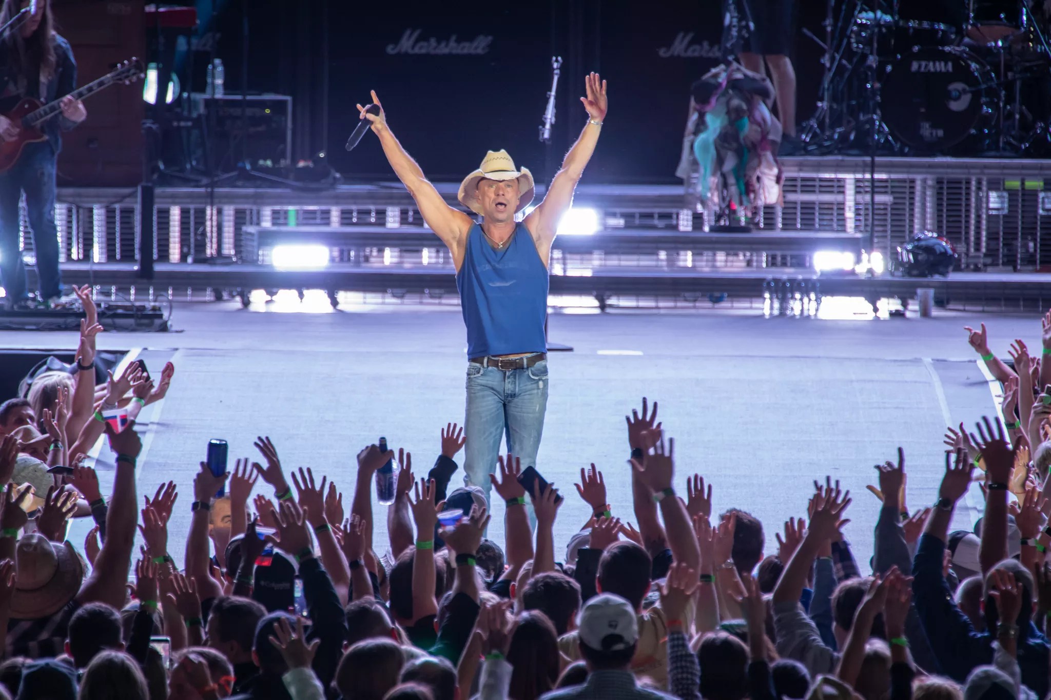 Chesney brings a world-without-borders flare to country music. Strutting around in his boots, blue tank top, jeans and beach-bum cowboy hat, he opened his concert with “Have Another Beer in Mexico.” As he closed out the night after signing a guitar, hats and license plates with his pal Peyton Manning, Chesney told the audience, “Adios. I love you.”