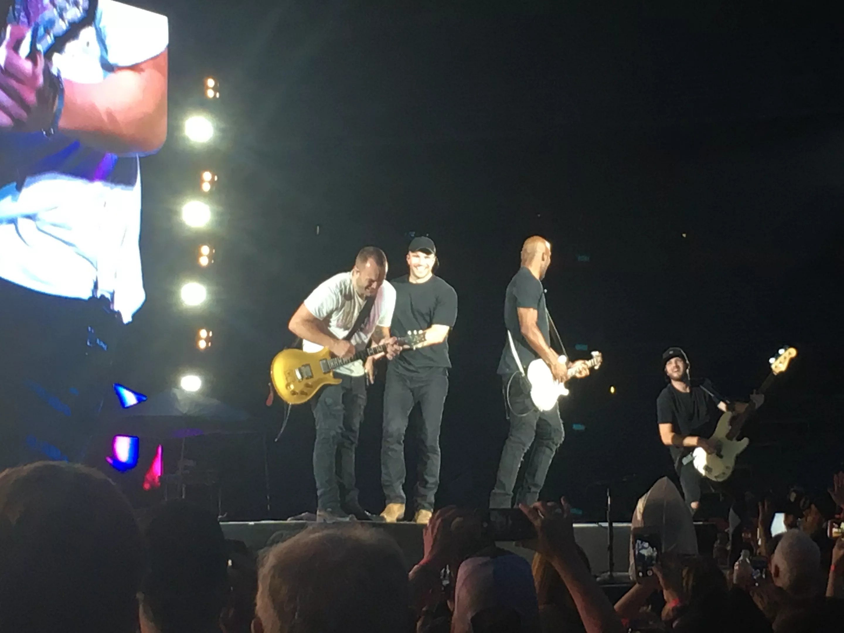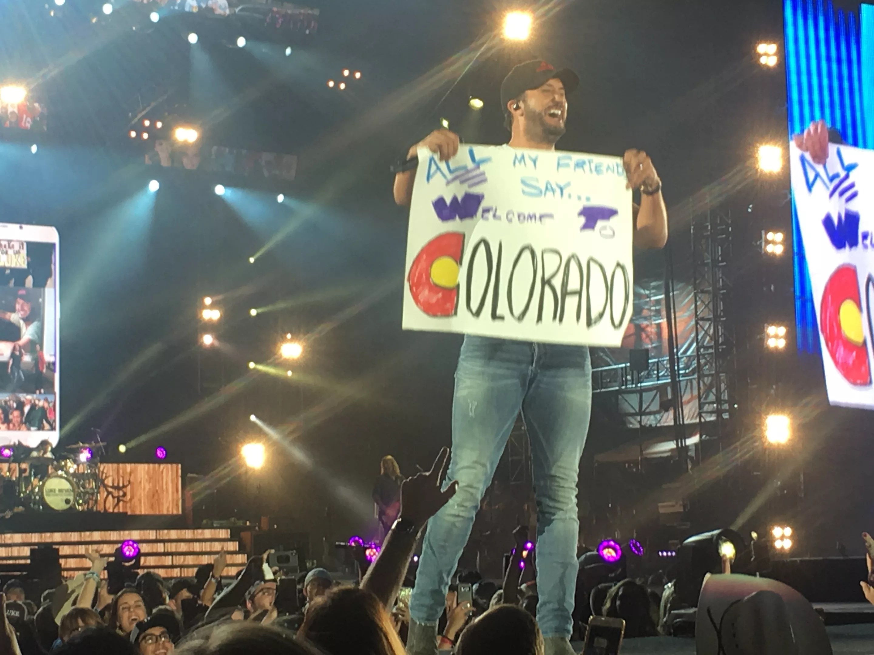 Bryan’s attention to detail in his interactions with the crowd is exceptional. He made sure that the first person he hi-fived during the show was a little girl, he constantly pointed at different people to show his connection, and he went out of his way to sign as many autographs as he could during instrumental breaks in the music. One fan gave him a Colorado flag, so he took it and waved it back and forth. During “All My Friends Say,” he found someone who had a sign that read, “All my friends say welcome to Colorado.” He held it up with a joyful smile before returning to the mic and finishing the song.