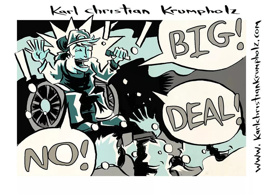 “We got around and down into the pit, when Joe tried to re-position how he held my chair up and tipped me out. It felt like the music stopped. The packed crowd gasped, while everyone lunged to catch the falling fragile baby. I somehow caught myself on Joe’s shoulder, and Wesley reached from behind to scoop me back into the chair as they proceeded through the crowd. I held on for my dear shaky life like I was riding a mechanical bull. Finally I made it on stage, gasped for the biggest breath, thanked my angels for letting me live, and rapped, ‘No! Big! Deal!'” Karl Christian Krumpholz