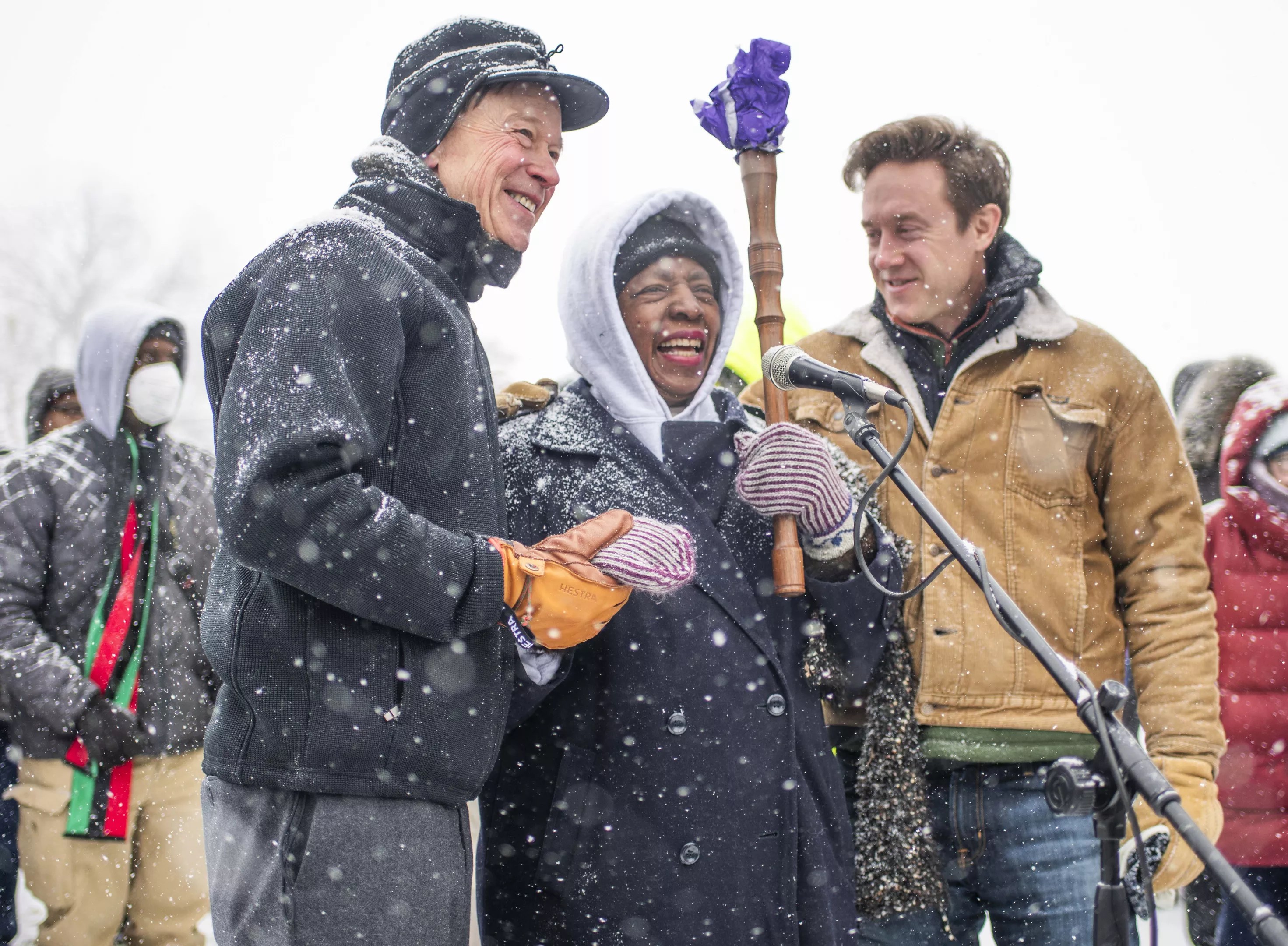 Know Colorado Black historian Charleszine “Terry” Nelson handed the ceremonial MLK torch to Senator John Hickenlooper, the 43rd mayor of Denver (left), and the 46th mayor of Denver, Michael C. Johnston.