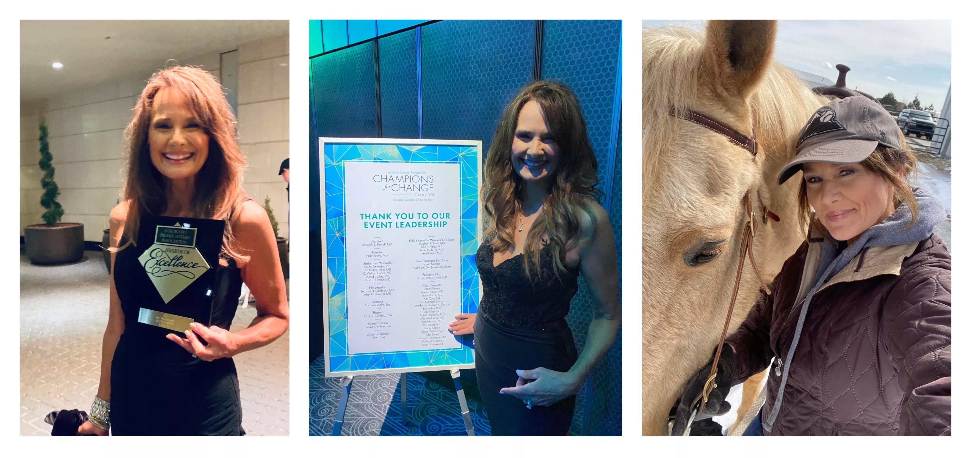 Kathy Sabine after being named best meteorologist at the Colorado Broadcasters Association’s 2023 awards banquet on April 22; a portrait from her appearance at the Skin Cancer Foundation’s May 10 Champions of Change Gala; an image with one of her beloved horses.