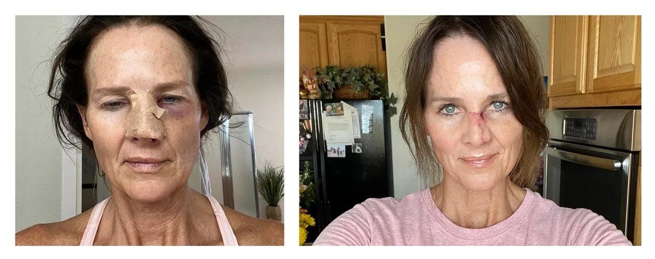 “Mohs doctors say skin cancer is like an iceberg: You may see the tip of the iceberg, but what lies beneath can be so much bigger, deeper and more extensive,” she notes. “So when they do a Mohs procedure, you lay there for an hour or so – go under the microscope. And if your margins are clear of cancer, they do a really cool cosmetic procedure and sew you up. But in my case, it took three cuts. They took one cut, put it under the microscope, and went back again to do another. That’s why there was a big hole on the side of my nose. Then they saw another spot near my eyes and found another cancer cell – and that meant they had to do another Mohs procedure. Then they took me over to the hospital, and the plastic surgeon met me there. That surgery went on for hours as well, because with so much of my nose gone and the other cancer they found, they had to come up with a whole new plan for me.”