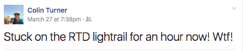 Posted at 6:38 p.m.: “Stuck on the RTD lightrail for an hour now! Wtf!”
