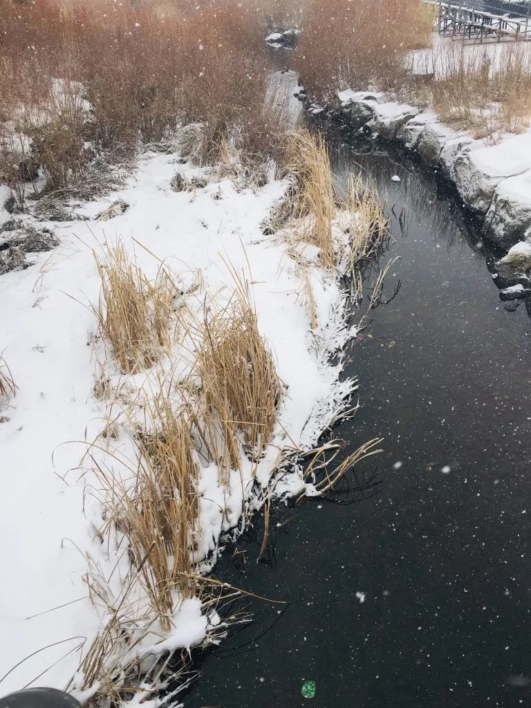 On the other side of Overland High School, I see a creek running dark and slow. Chilled molasses on a wintery day.