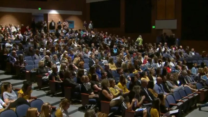 The crowd at the May 2 meeting filled Arapahoe High School’s theater.