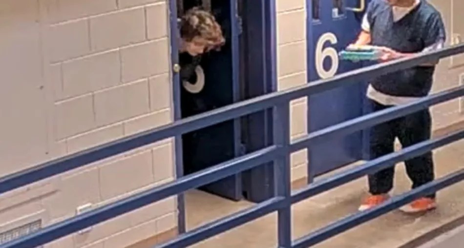 A surveillance image of Avery Borkovec stumbling out of his cell shortly before his final collapse.
