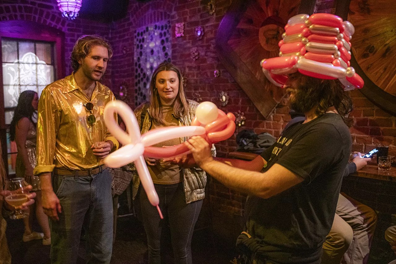 He followed the kit’s instructions to learn how to twist balloons into figures that could amuse an audience. He hosted lemonade stands for thirsty customers, with add-ons that included balloon animals and magic tricks. His parents would drop him off at local fairs and carnivals, where he would do tricks and make balloon creations, just as he does at bars now.