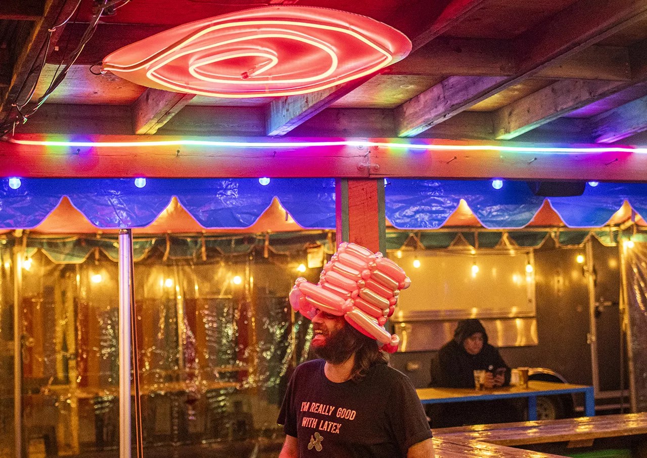 He cheekily offers “chocolate or vanilla” and “hat, bracelet or strap-on” options to drunken revelers. The balloon penises even include a small white balloon dangling off the tip, into which Schmitt inserts a flashing LED light that’s either white or rainbow, to signify “the cum part,” he says.