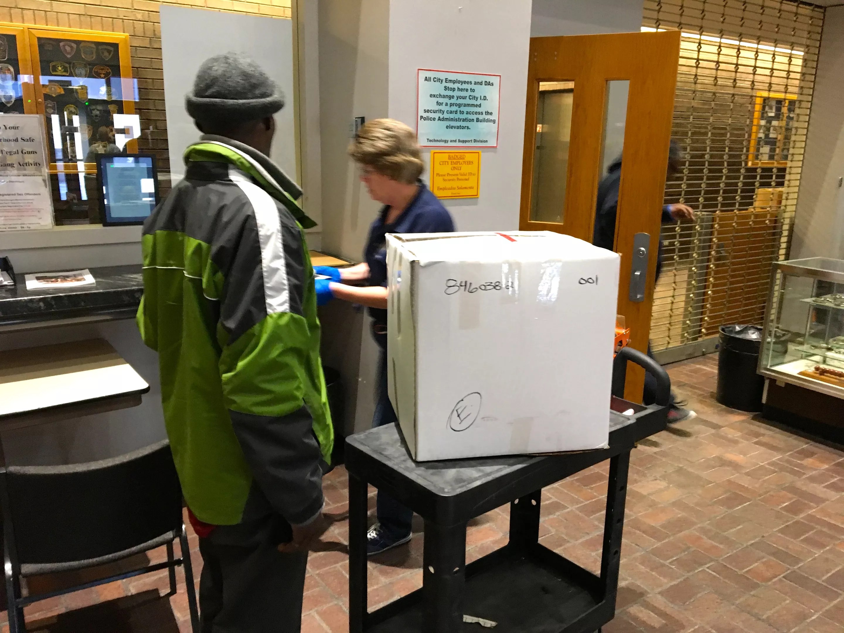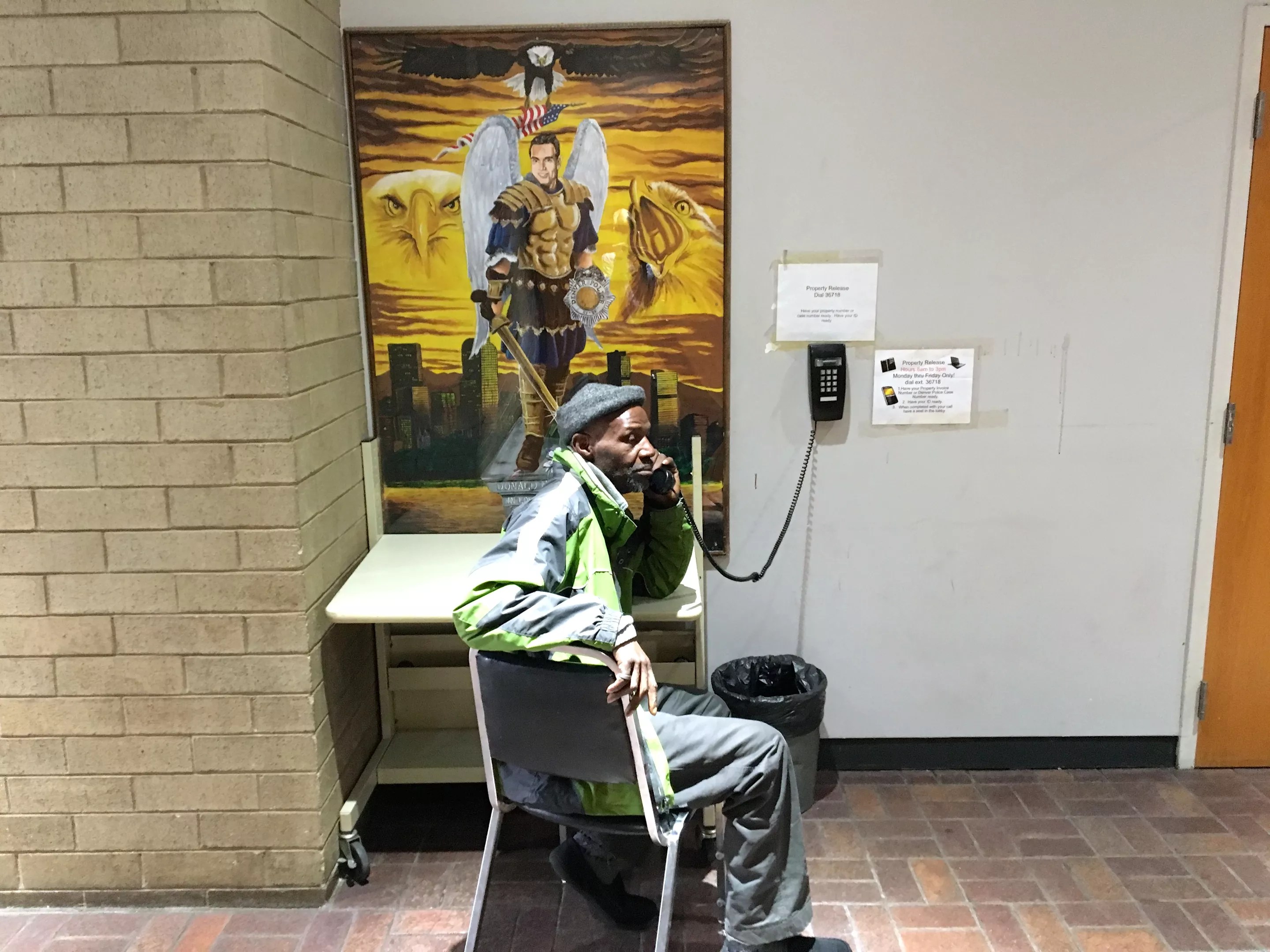 Anyone seeking to repossess their items from DPD must speak to an attendant through a wall-mounted phone next to a painting inside the headquarters lobby
