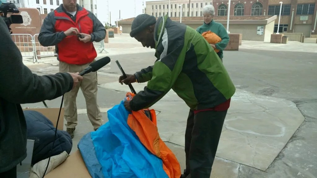 Burton opened it and discovered a tent, sleeping bag and blankets taken from him at 27th and Arapahoe. He’s not sure why he wasn’t able to get his additional sleeping bag and blankets that were taken in front of the City and County Building.