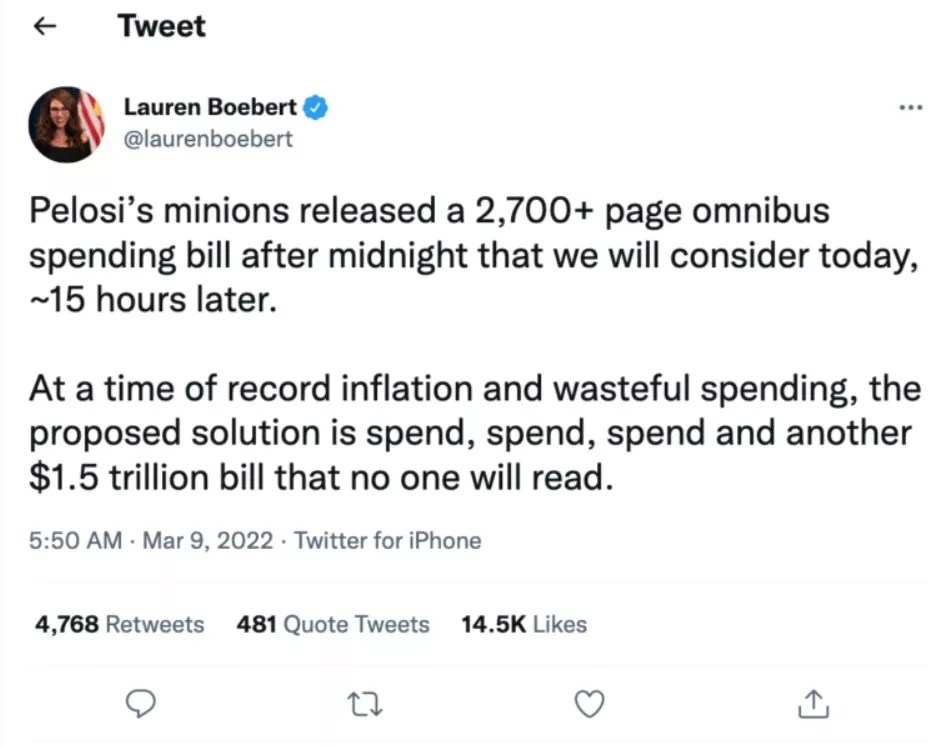 On the U.S. Forest Service: “I am absolutely paying attention to what the Forest Service is doing,” said Boebert. This was after she once again falsified her voting record in Congress, claiming that she helped appropriate $48 million for the Forest Service when in actuality she fought hard to defeat that funding. In protesting the bill on Twitter, she criticized it for its length, and said that it’s something “no one will read.” Which is sort of like every fourteen-year-old’s argument for not reading Moby-Dick in English class.