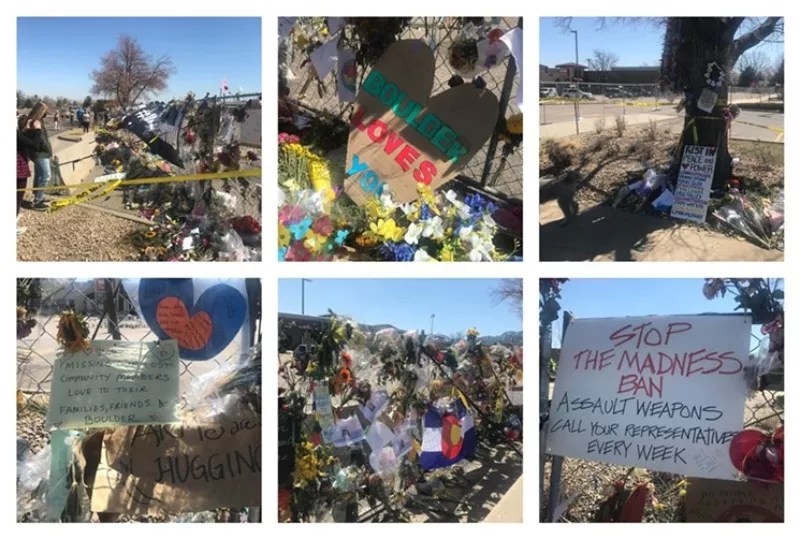 A collage of images from the memorial fence around the Table Mesa King Soopers on April 1, 2021.