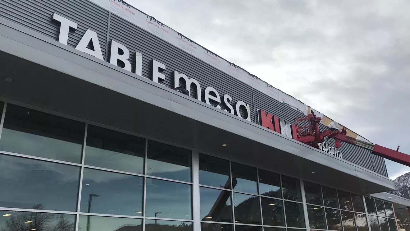 A worker readying new signage at the Table Mesa King Soopers on January 12.