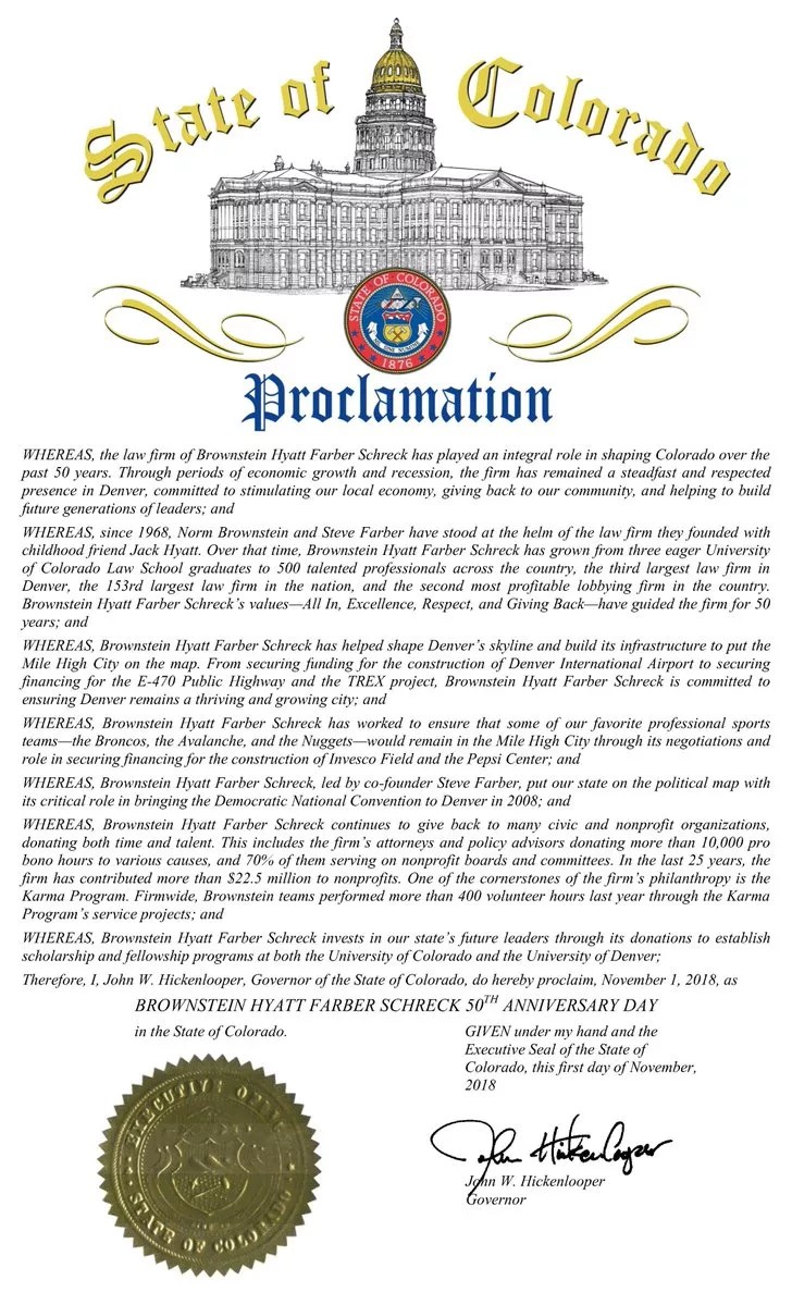 November 1, 2018, was officially Brownstein Hyatt Farber Schreck 50th Anniversary Day in Colorado, thanks to a proclamation by Governor John Hickenlooper.