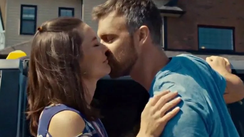 Chris Watts (Sean Kleier) gives a goodbye kiss to his wife, Shanann (Ashley Williams).