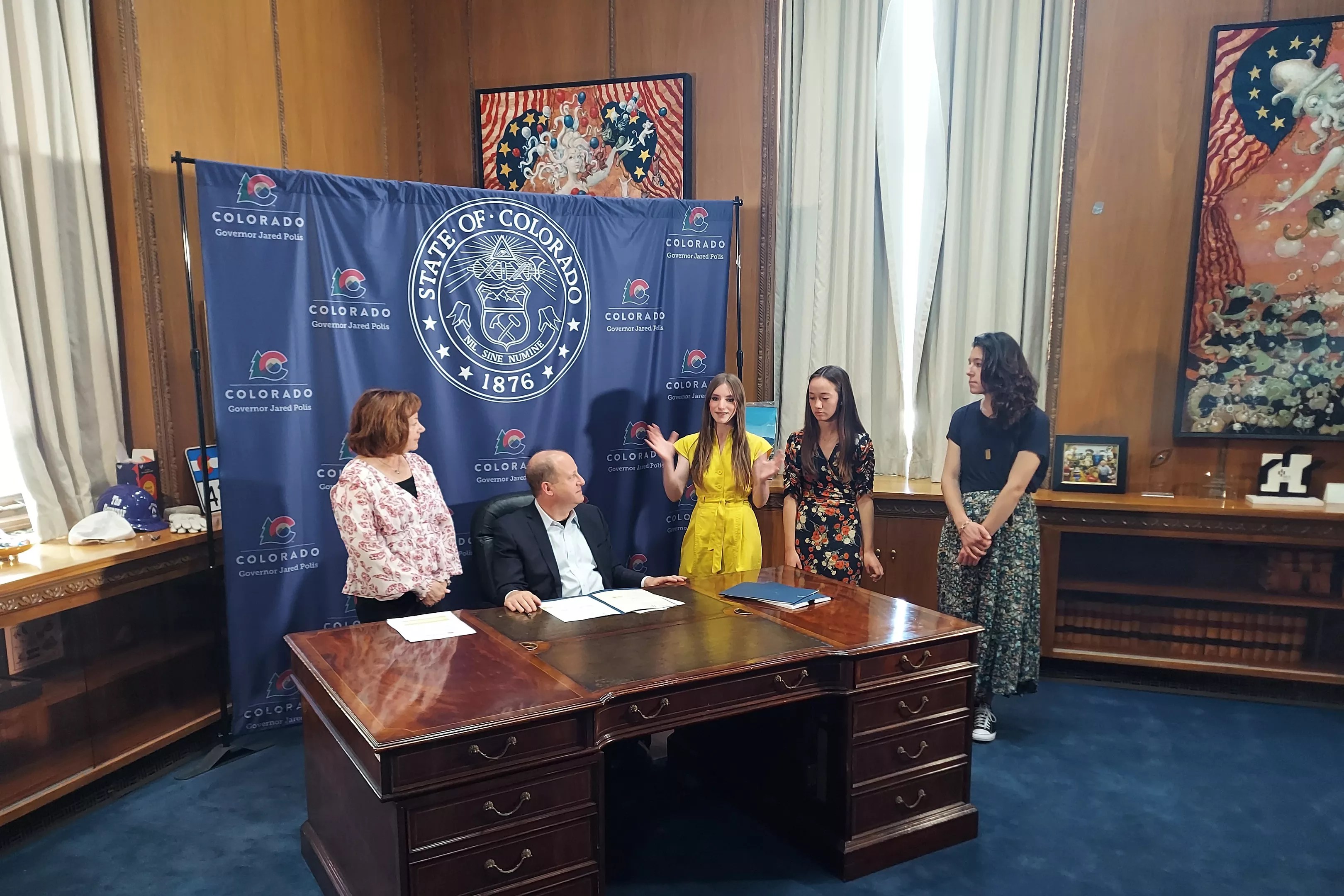 Aimee Resnick (in yellow) speaks to Governor Jared Polis during a bill signing for one of her COYAC proposals.