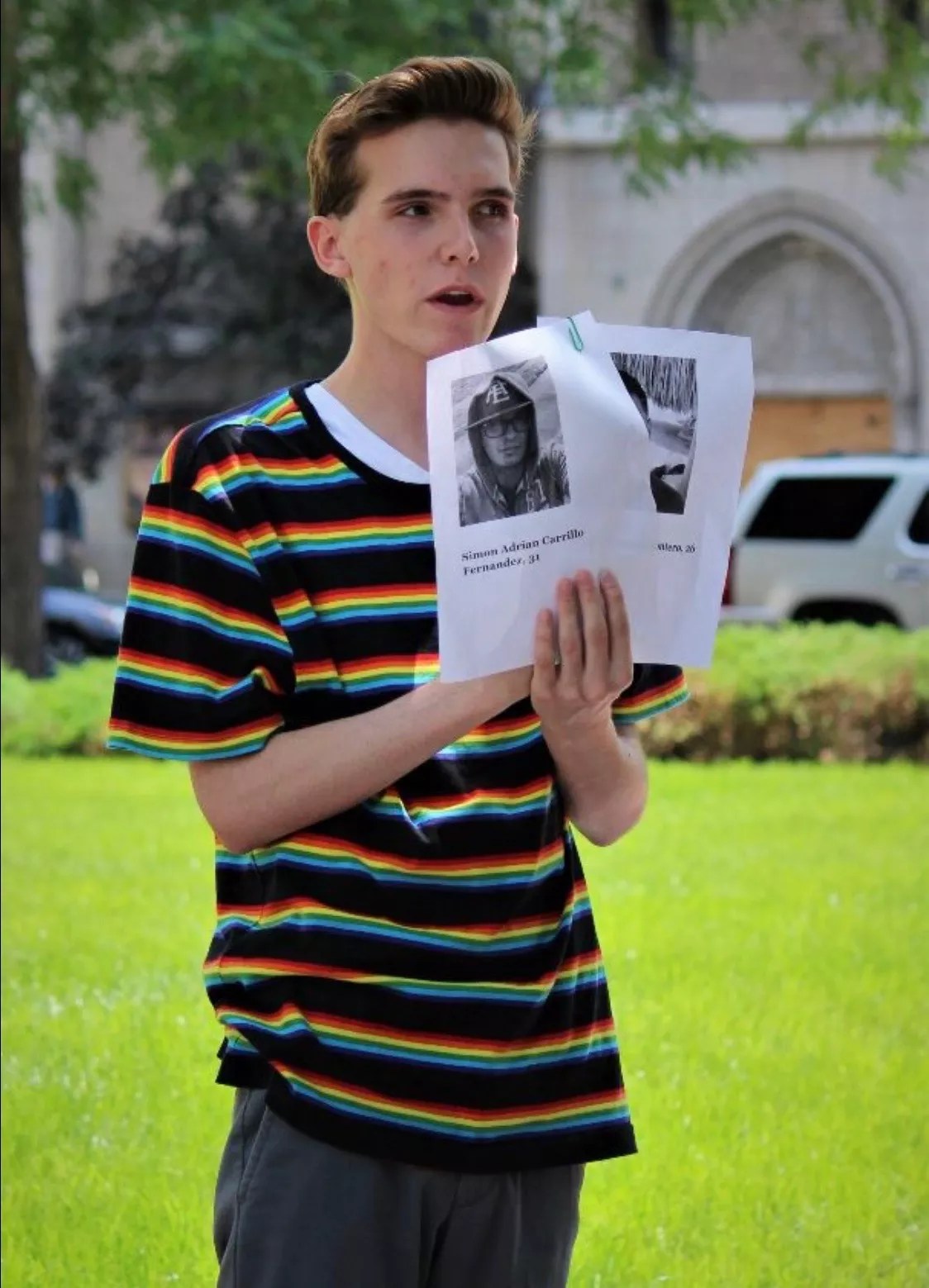Students Demand Action State Director Sam Craig holds profiles of two victims of the 2016 shooting at Pulse Nightclub in Orlando, Florida, at a protest in front of Senator Cory Gardner’s office.