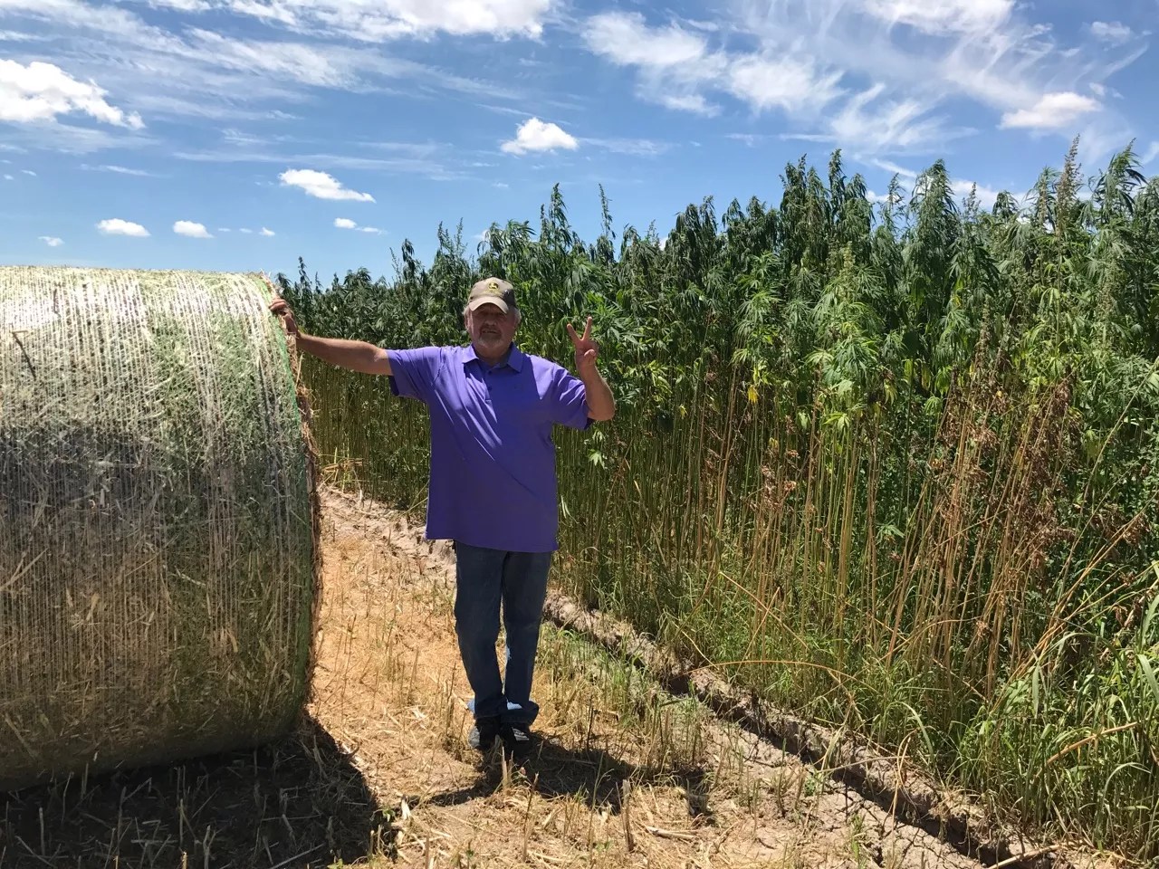 Bill Billings, co-founder of Colorado Hemp Project, stands next to a rolled bale of hemp stalks.