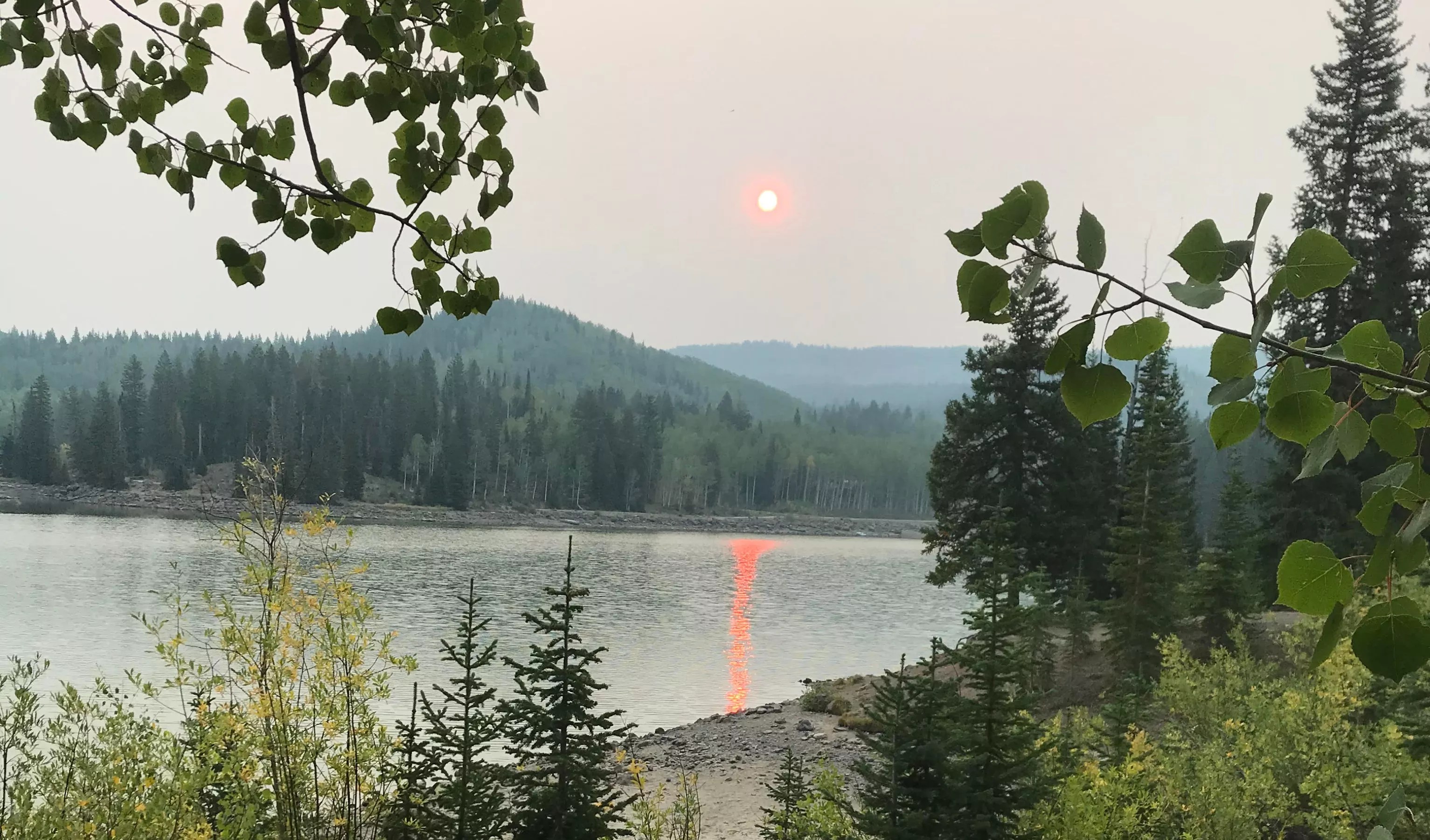 In the process, we discovered that the smoke and haze had returned to the Grand Mesa, as they would be in Denver and most of the state, turning the sun and its reflection on the surface of a nearby lake a brilliant but rather disturbing red.
