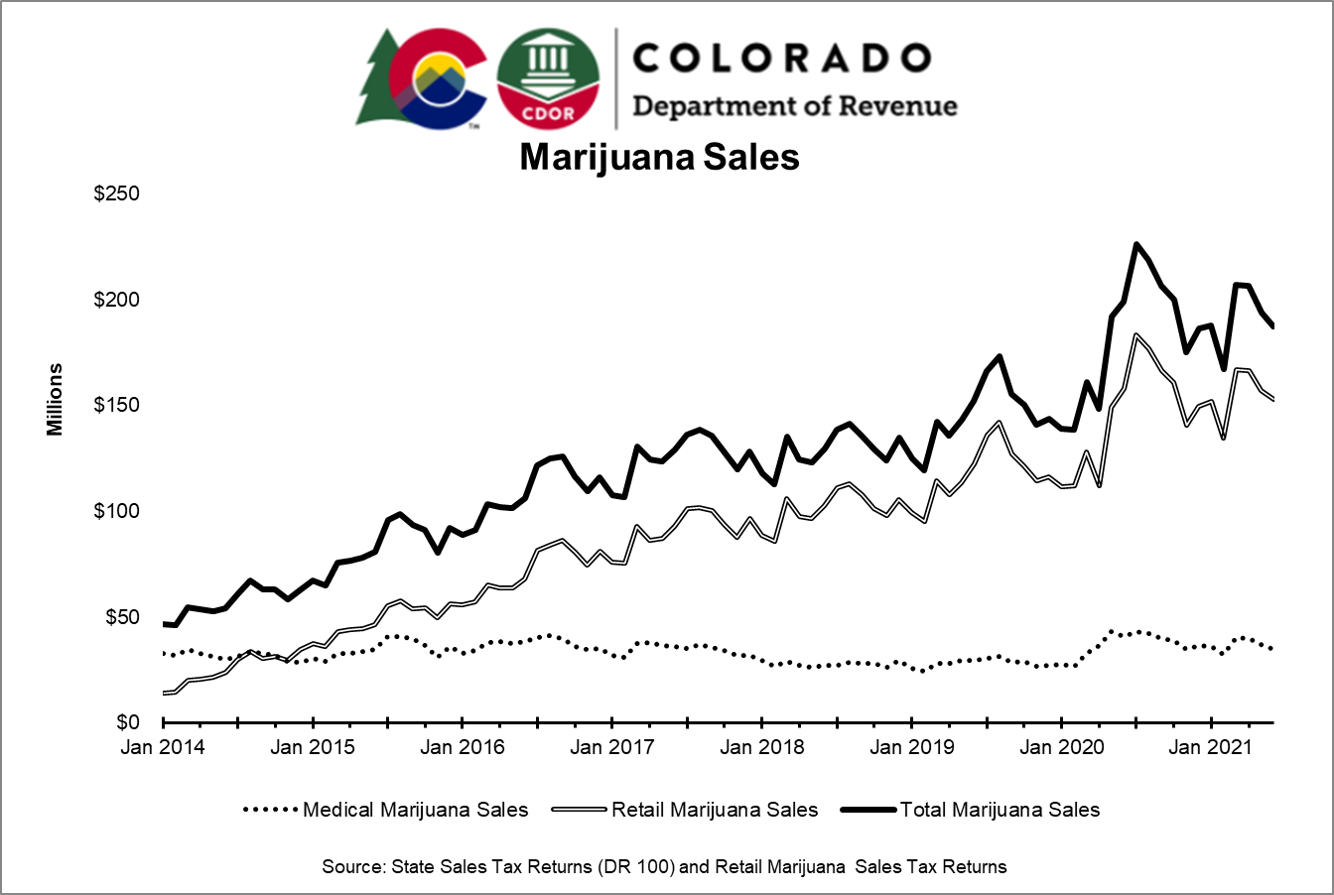Although June sales typically benefit from a summer jump in dispensary action, this June’s marijuana sales totaled just under $187.3 million, according to the state Department of Revenue, a 3.5 percent drop from May and 9.2 percent lower than April’s sales.