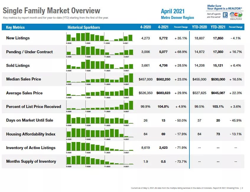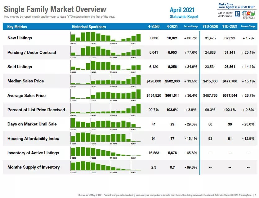For example, note that the average sale price for a single-family home in Colorado in April was $661,511, a 36.4 percent increase over the same month in 2020. In contrast, the median sales price was $502,000, a 19.5 percent bump from the $420,000 median mark established a year ago.