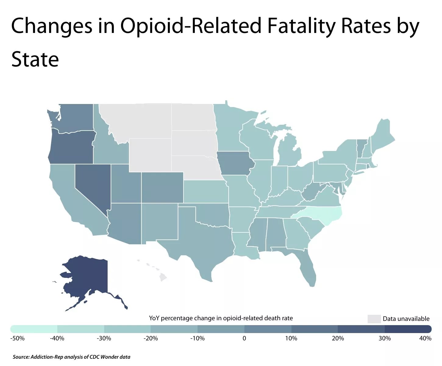 Researchers from Addiction-Rep, a marketing firm for rehab centers, used data from the Centers for Disease Control and Prevention through June 2024 to reach these conclusions. They suggested the states with bigger gains were also those that originally had a higher number of deaths from opioid-related causes. The rising presence of fentanyl mixed with other drugs, like cocaine and methamphetamines, has risen in western states in recent years, according to Addiction-Rep, leading to the higher number of deaths.