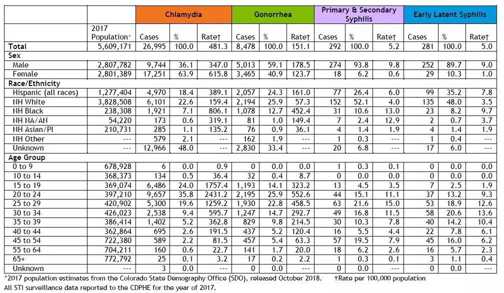 Age doesn’t exempt Coloradans from STIs, either, as indicated by one of the report’s most startling revelations: Eighteen newborns were diagnosed with congenital syphilis in the 2013-2017 range.