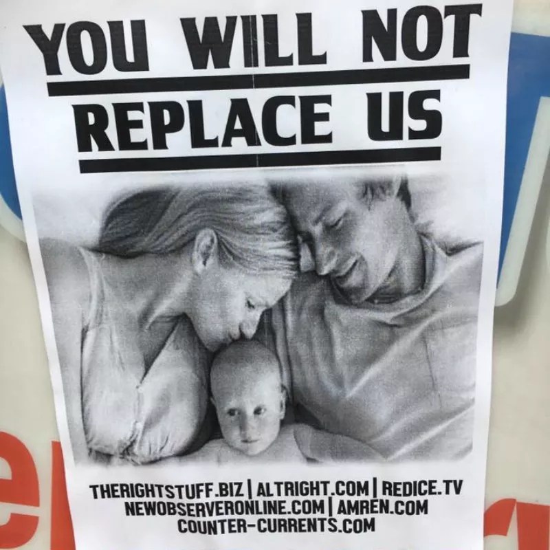 An alt-right poster that’s turned up locally. Its message utilizes the “You Will Not Replace Us” chant heard at Charlottesville.