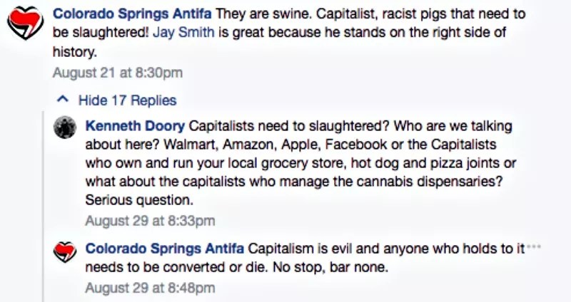 For more information on this phenomenon, we reached out to a Colorado Springs Anti-Fascist spokesperson who goes by the name of Rosa Luxemburg – a nom de plume that nods to a historical figure she describes as a “famous German anarcho-Marxist.” The following Q&A, conducted via email a few days before seven reputed antifa representatives were arrested for rock-throwing amid a demonstration in Portland, Oregon, digs deep into alleged instances of alt-right disinformation in the Springs and Denver – where the Rocky Mountain Antifa is said to have been targeted – as well as nationwide. The conversation is illustrated by images provided by Luxemburg, including a Facebook screen capture that sports a line intended to undermine the Colorado Springs Anti-Fascists: “Capitalism is evil and anyone who holds to it needs to be converted or die. No stop, bar none.”