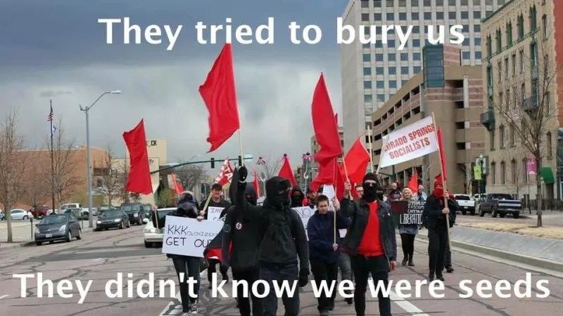 A Colorado Springs Socialists meme featuring an image from the March protest.