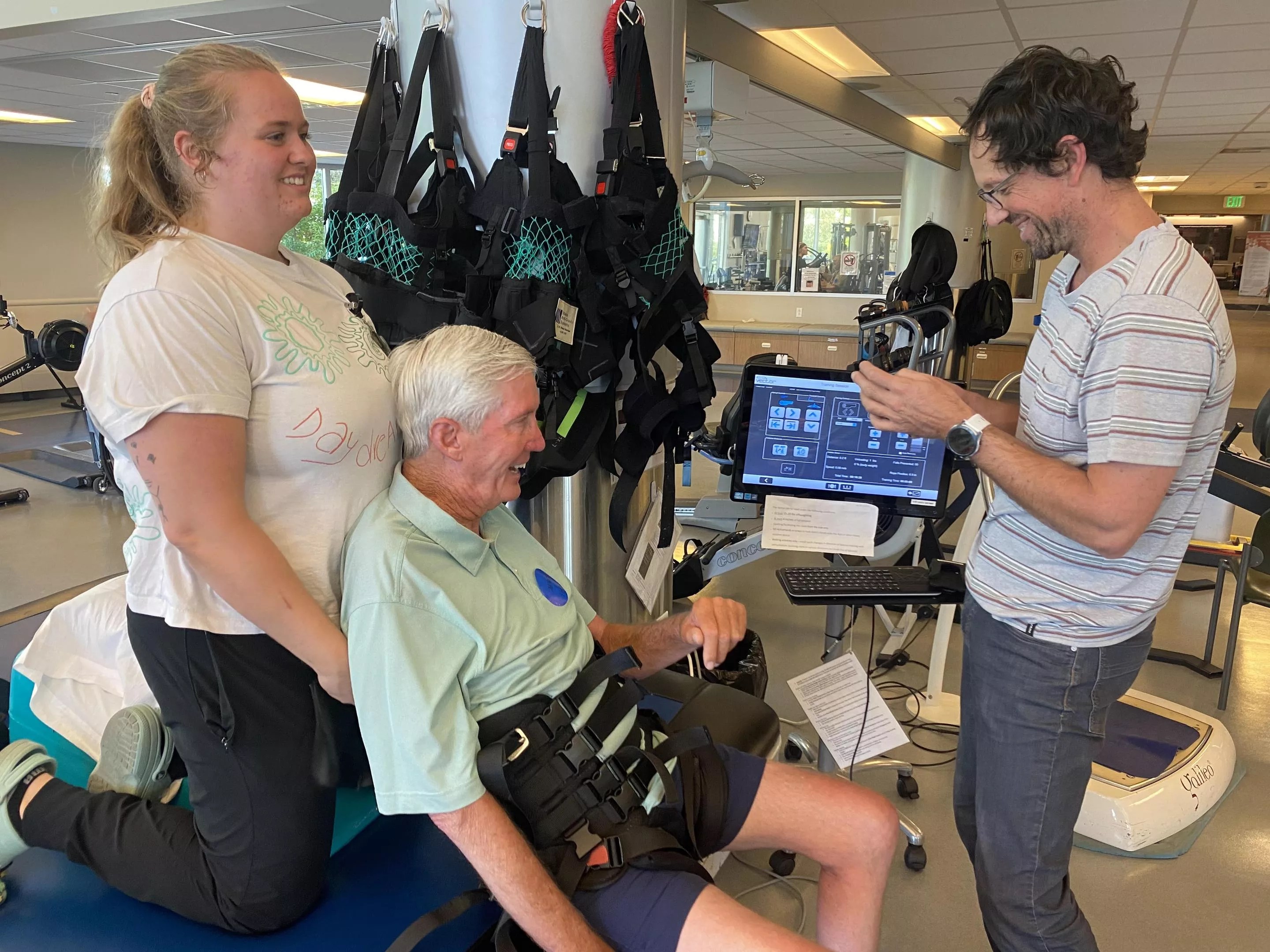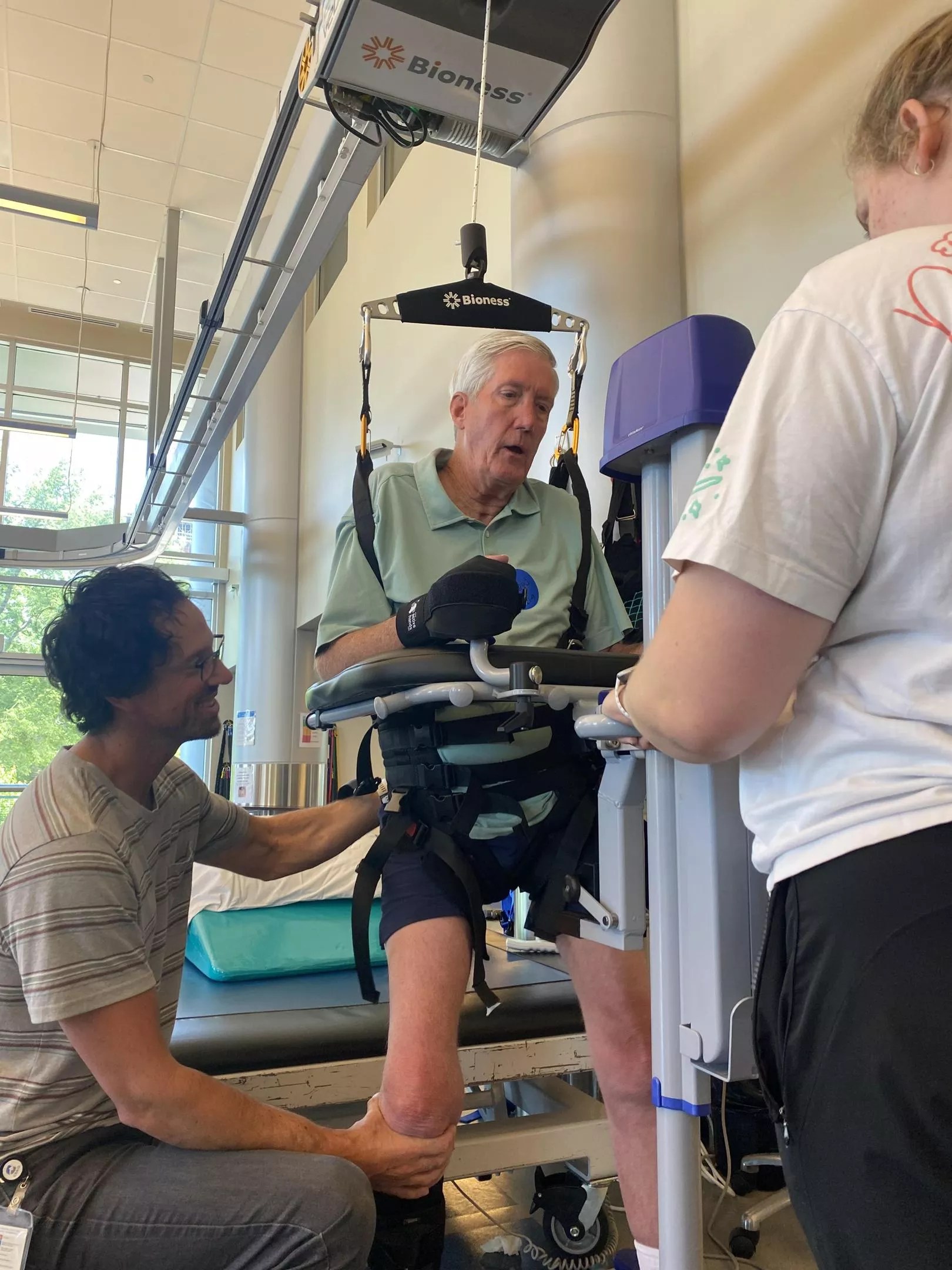 The PEAK Center’s Raena Cummings and Christopher Agresta strap Enstrom into the Bioness Vector Gait and Safety System.