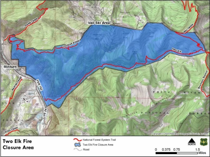 The areas closed to the public because of the Two Elk fire.