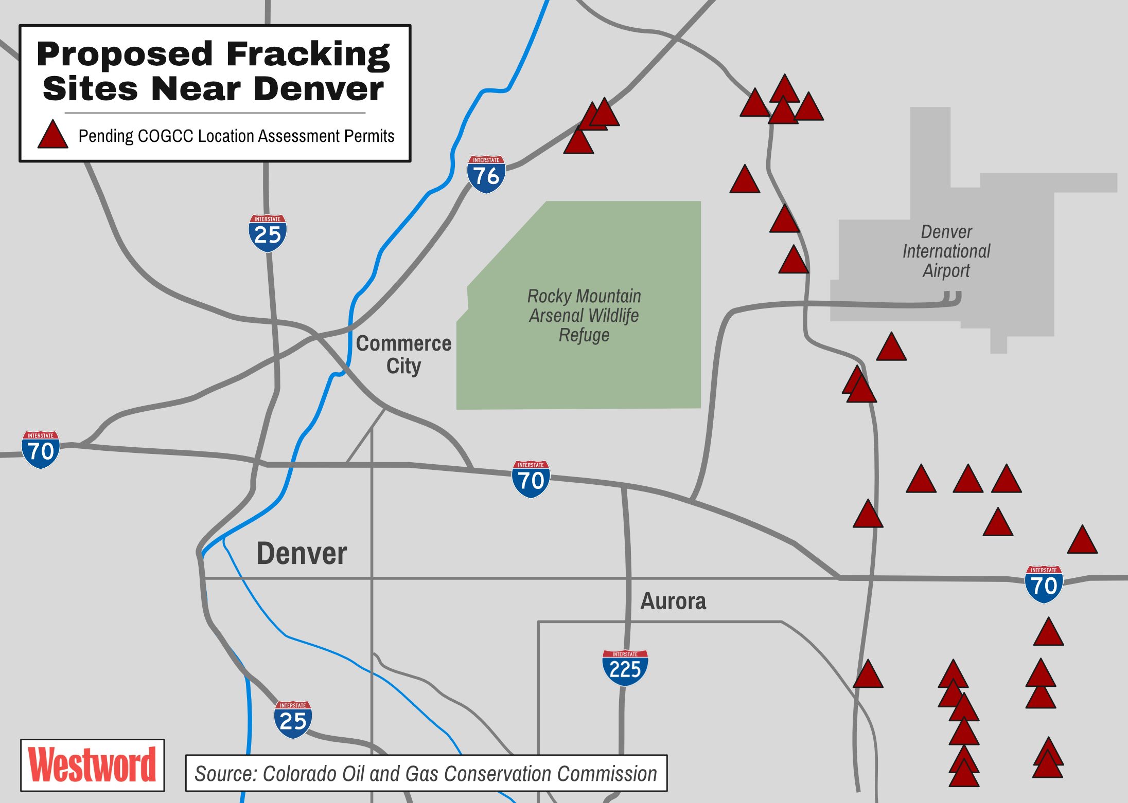 Commerce City isn’t the only municipality where drilling activity is gradually making its way toward Denver city limits. At least a dozen major projects are pending approval in Aurora and unincorporated Adams and Arapahoe counties, according to data from the Colorado Oil and Gas Conservation Commission. The COGCC received applications for nearly a hundred wells in and around Aurora in January alone, including a 32-well project less than a mile northeast of Green Valley Ranch; it would be Aurora’s westernmost fracking site yet.
