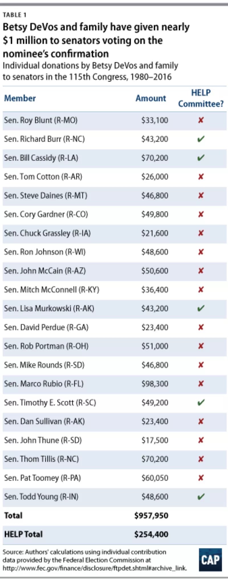 He’s not the only one. DeVos, a vocal booster of charter schools and vouchers whose critics see her as an enemy of public education, is a big donor to conservative politicians, as are members of her well-heeled family; she’s married to the heir of the Amway fortune. CAP reveals that the DeVos clan has given nearly $1 million to senators in the 115th Congress between the years of 1980 and 2016.
