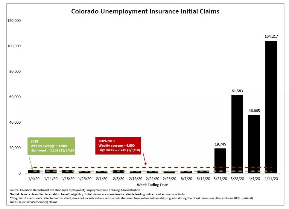 On April 16, as the COVID-19 crisis deepened, the Colorado Department of Labor confirmed that more than 100,000 initial claims for unemployment were submitted the previous week, even as a new study showed that the state’s year-over-year increase in such filings was the nation’s worst.
